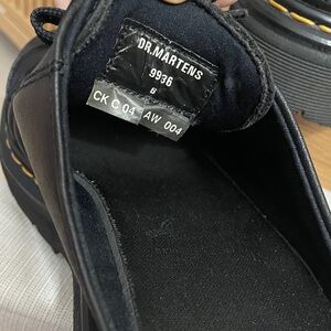 Dr. Martens 1990s Vintage Black Chunky Mules in Size 6 features an Open-back, Easy Slip-on style, an Air-cushioned sole, Leather upper, Five-Eye Lace-up Closure and a Rounded toe. Model number: 9936. Made in England. Used in Very Good Vintage Condition with wear from use.