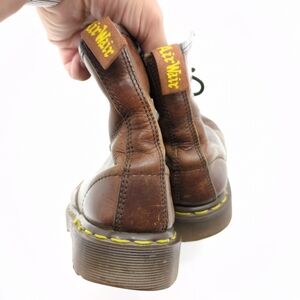 Dr. Martens Vintage Made in England 1460 Oxblood Brown 8 Eye Combat Boots Size 5 Women US, 4 Jrs US, 3 UK, 36 EUR. Brown Air Wair Tag. Good used vintage condition, some signs of wear throughout including some heel drag and wearing off of inside info and size. Size is estimated, see below.