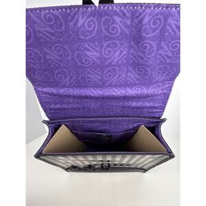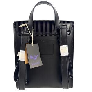 1. Mini Backpack Leather made from Smooth and Kiev leather that features spiderweb buckle, removable charm of Wednesday and Enid’s stained-glass bedroom window, gloss stripes across the front and the flap, and leather lace detailing.