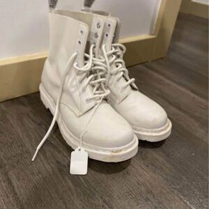 White boots with lace-up design. Durable and stylish. Not broken in yet. Only with a couple times. Need a little cleaning in the front.