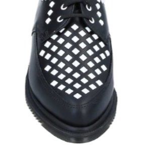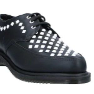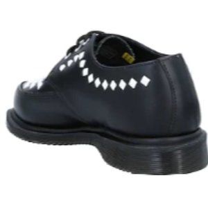 Dr Martens 'Willis' men's retro 1950s studded creeper shoes in smooth black leather. The retro 50s creeper shoe is an iconic staple in the world of footwear, worn by subcultures including goth, psychobilly and punk. The Willis stud creeper by Dr Martens possesses the typical retro creeper silhouette (inspired by the classic 50s Teddy Boy look) with a pointed toe and 3 eyelets with strong lacing combined with recognizable Dr Martens DNA, including AirWair soles resistant to acid, petrol and oil. Willis has the inclusion of white pyramid studs across the upper for an edgier creeper and is made from smooth, durable Dr Martens leather that is strong enough to withstand your skanking, jives, and wrecking