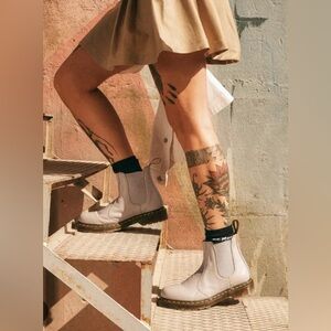 Elevate your look with these sleek New Dr. Martens ankle boots. Light gray/taupe finish adds a modern touch. Durable and stylish for everyday wear. Not lined Sherpa lining. Size 7. No box.