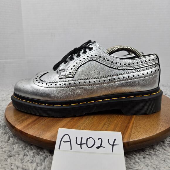 Dr. Martens Womens 8 3989 Metallic Silver Leather Brogue Long Wingtip Oxford