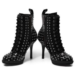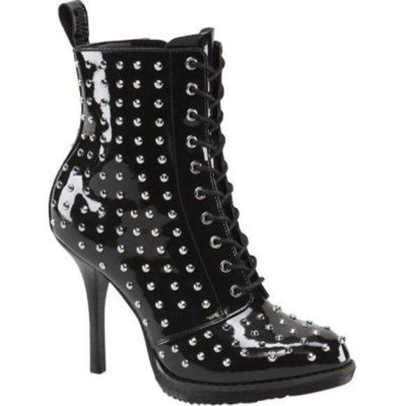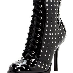 Our Zita collection is ultra-feminine and very Dr. Martens. 10-eyelet high heel boot. Studded black patent leather upper. Inside zip for fastening. Slender stacked heels and non-slip grooved sole. This sole is cemented to the base layer. Heel Height - 4 inches.