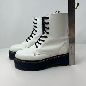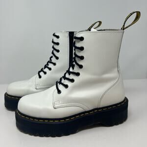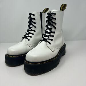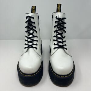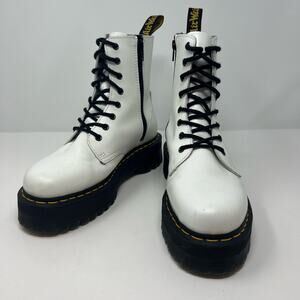Dr. Martens Jadon Boots. White in color. Women's size 9 and Men's size 8. These airwalk Jadon boots have a 2 inch lug platform quad sole and a black side zipper. These are the original 8 eyelet style made with Dr. Marten's smooth leather and crafted into an everyday fashion boot that gives off serious stylish vibes. The white and black color combination is an iconic fashion look that brings some serious game when worn. There are a few faint stains across the top of the boot and small scuffs, pictured. In preowned condition with minimal signs of wear.
