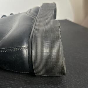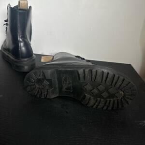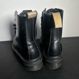 Tags: happy hour, upscale, luxury, brunch, dinner, special occasion, black leather, combat boots, platform sole, lace-up, goth style, edgy, chunky, durable, alternative fashion, ankle boots