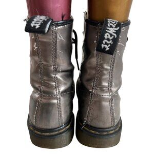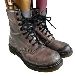 Dr Martens 1460W boots, pewter / silver faux leather, mid calf shaft, 8 eye lace up, chunky soles, fabric lining, US women's 5, preowned and shows wear on the soles, scuffing and visible wear throughout, tears on the inside heel area - see photos. They will be carefully wrapped and shipped in a padded envelope