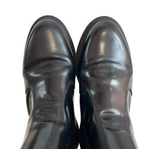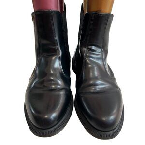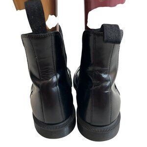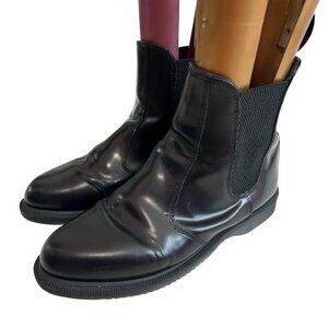 Dr. Martens Flora chelsea boots, black leather, pull on, US women's size 9, preowned and shows wear on the soles, scuffs and creases, insole heel liner is raised - see photos. They will be carefully wrapped and shipped in a padded envelope