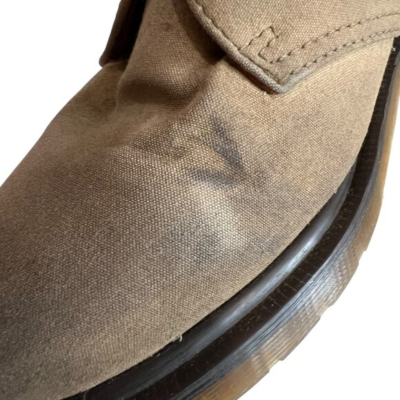 Dr. Martens Lester oxfords, beige - khaki fabric upper, round toe, slip on / faux laces, leather lining, rubber soles, US men's 7 or women's 8, insole length: 10", preowned and shows wear on the soles, discoloration and small flaws on the fabric - see photos