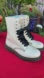 Worn Once Dr. Martens x Marc Jacobs “Redux Grunge Collection” Limited Edition Tall 1490 Boots. Vanilla colored shiny patent 10 eye boots. “Dr. Martens x REDUX GRUNGE COLLECTION 1993 / 2018 MARC JACOBS” black stitched tongue patch. Bright silver eyelets. High contrast black stitching against the creamy off-white leather. Black satin laces, and sole trim. DM’s trademark yellow welt stitching and black and yellow AirWair with Bouncing Soles pull loops.