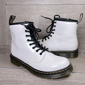 Dr Martens 1460 Pascal White Patent Leather 8-Eye Side Zip Lace Up Women’s Sz 5 Combat Boots in phenomenal condition. Great tread and gorgeous patent leather side zip combat boots. Get these today ladies.