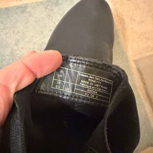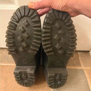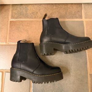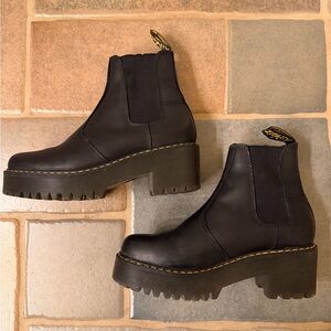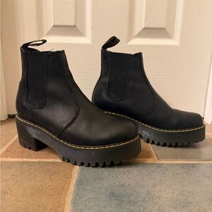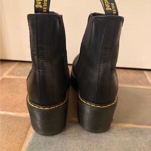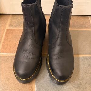 Platform Dr Martins. Black leather Chelsea boots with yellow stitching. Chunky sole for added height and comfort!
