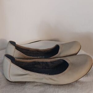 Step out in style with these elegant tan faux leather ballet flats. Size 6.5. Perfect for any occasion, these shoes offer both comfort and sophistication.