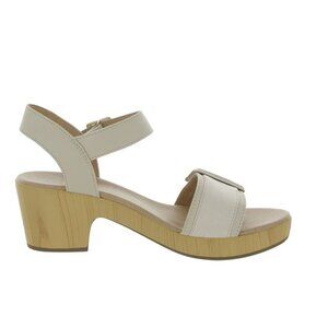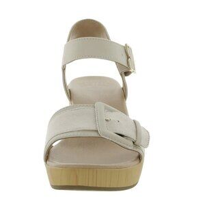 Dress sandal with statement buckle, faux wood heel for lightweight comfort, and platform heel