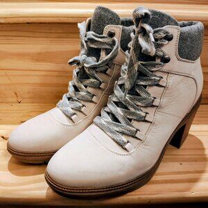 Fireside Heel Boots in shade Tofu. They are in decent condition. Worn 10 times or less. They do have slight wear, like scuffs/creases. They are a size 9.5