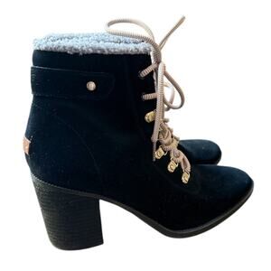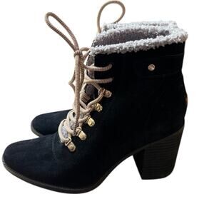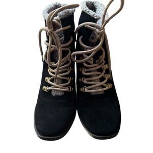 Step into cozy winter style with these practically new Dr. Scholl’s Original Collection boots, size 7.5M. Crafted with a black suede leather upper, these boots feature faux shearling lining, sturdy block heels, and gold-tone hardware with hiking-inspired laces. Perfect for chilly days with a fashionable edge—warm, comfortable, and barely worn (see soles).