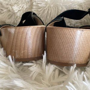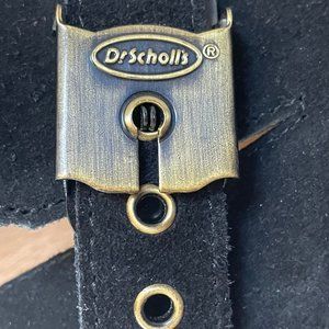 Excellent pre-loved Dr. Scholl's clogs. Soft black suede genuine leather upper. Light brown/tan wooden sole. Bronzed classic Dr. Scholl's adjustable hinge buckle for a comfortable fit. Women's size 10. Very minor scuffing on wood and suede. Great condition on these beautiful and versatile shoes. See pics!