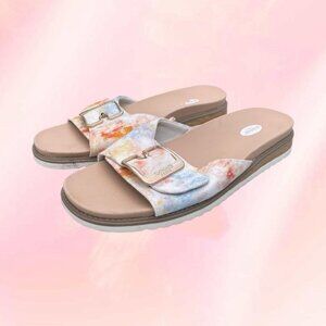 Gorgeous Dr. Scholl's Originalist 2 Slide Sandals with a metallic buckle detailing in the watercolor blue clay color and cream soles 🦋