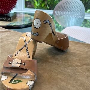 Chic mules with a fun golf design. Tan leather strap with buckle detail. Perfect for casual outings.