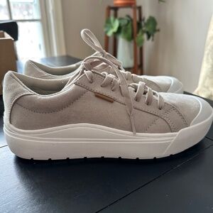 New-in-box Dr. Scholl’s Time Off Sneakers in Oyster. Very comfortable. Never worn. I bought two similar pairs and decided just to keep one of them. Comes with two sets of laces, white and tan.