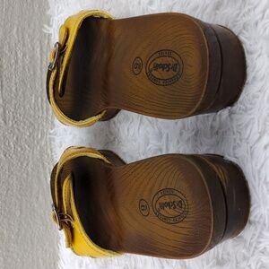 Dr. Scholl's Vintage Women's Mustard Yellow Open Round Toe Five Hole Buckled Strap Upper Contoured Footbed Low Wedged Heel Mule Sandal Shoes. Rubber Sole. Rubber Footbed. Strap Marks Per Photos. Upper Heel Scuffs. Sole Wear. Loose Logo Sole Strip. Size 9. Color May Vary Due To Lighting.
