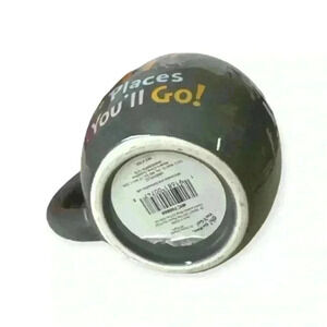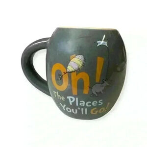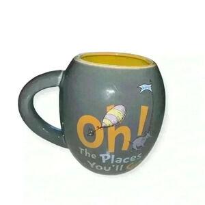 This charming gray mug features the iconic phrase "Oh, The Places You'll Go!" from Dr. Seuss' beloved book. With a cheerful, whimsical design, it includes illustrations of an elephant and a striped hot air balloon. The mug has a contrasting bright yellow interior, perfect for adding a pop of color to your morning routine. Ideal for fans of Dr. Seuss and those who enjoy a touch of nostalgia with their coffee or tea!