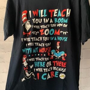 Shirt reads: I WILL TEACH YOU IN A ROOM. I WILL TEACH YOU NOW ON ZOOM. I WILL TEACH YOU IN A HOUSE. I WILL TEACH YOU WITH MY MOUSE. I WILL TEACH YOU HERE OR THERE. I WILL TEACH BECAUSE I CARE.