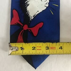 This fabulous necktie is ready for your Holiday office parties! It is made of 100% silk in blue with graphics of "The Cat" from Dr. Seuss's "The Cat in the Hat" under the mistletoe. It is in GUC with no stains or holes seen. See pictures for details and measurement of width.