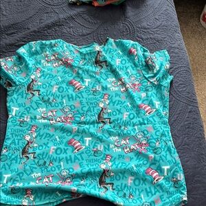 Vibrant scrub top featuring Dr. Seuss characters. Comfortable and fun design. Perfect for work or casual wear.