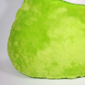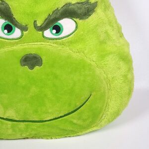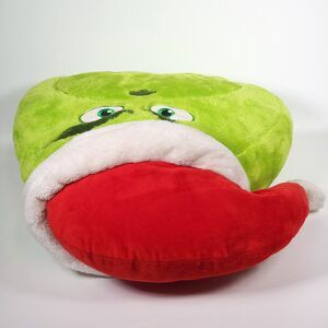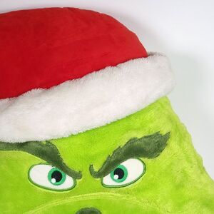 Soft and cuddly Grinch plush pillow featuring Dr. Seuss' classic holiday character wearing a red Santa hat. This large 16" stuffed pillow makes a great seasonal decoration or cozy gift for fans of How the Grinch Stole Christmas.
