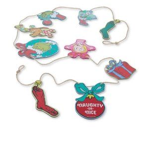Dr Suess' The Grinch Who Stole Christmas 8 foot long wall garland decoration features iconic Grinch characters and a seasonal twist with presents and stockings. Made of MDF and strung on a jute cord, this wall décor can be used to brighten up any room. Placed on a wall, a mantel or even a Holiday tree, the Grinch garland will be a great addition to any gathering.