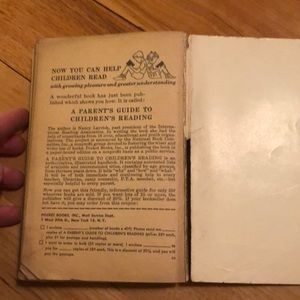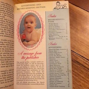 Vintage Dr.Spock childcare book. Front and back are in rough shape. Starts on page 69 (first part missing). Hidden gem is the chart inside with cool old advertising. Goes to 600+ pages with first 68 missing. From the 50s or 60s (copywright page missing).