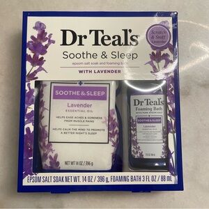 Relax with Dr Teal's Soothe & Sleep set. Includes lavender epsom salt soak and foaming bath. Perfect for a calming bath experience.
