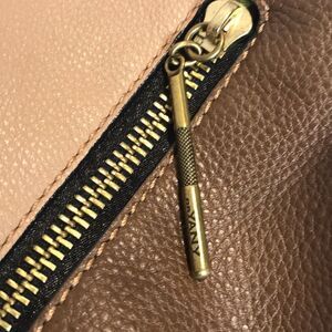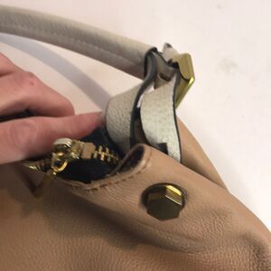 Dr Yany brown/beige color block leather hobo shoulder bag. Has gold tone hardware and front zipper pocket with gold toggle and top zipper opening. Has gold brackets that hold beige leather straps. Interior is immaculate with signature logo lining. Double zipper pockets and 2 open pockets on interior wall. Has a small pen mark on bottom as noted in picture.