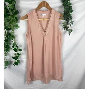 Pale Blush. V neck with loop styling. High Lo Hem. Semi- sheer. Loose and relaxed fit.