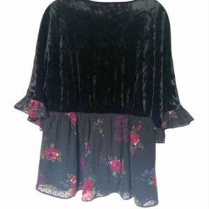 DR2 (Daniel Rainn) Black Velvet Mixed Media Floral Babydoll Top - Size L - Trendy - Daniel Rainn-Nordstrom- 3/4 Sleeve Black velvet with floral sheer fabric on the bottom and edge of sleeves. Measurements taken with the garment laying flat - 21" in across the chest / 27" in length.