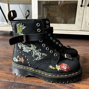 Black leather boots featuring buckle detail and yellow stitching. Red accents add a pop of color.