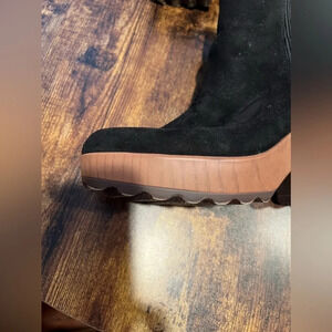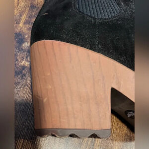 Women’s lug bootie. Chucky, platform heel. Faux suede look. Pull on. Stretch panel on each side. Round toe. Dr. Scholl’s comfort! Very good user condition.