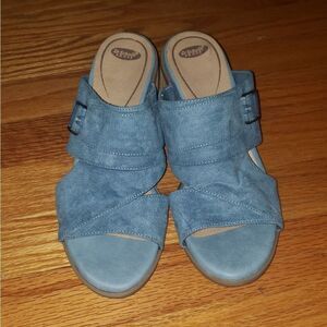 Dr Scholls blue textile heels Women Size 7.5 heel is 2.5 inches high These are used and will not be in new condition. Please keep that in mind when looking.  Thanks. Gently used. No rips or tears. No box. We always ship carefully packaged and box ship asap. Contact with any questions. Pair in photos are what you are purchasing. Make sure to follow us as we list daily and offer discount pricing on Bundles of 2 or more.
