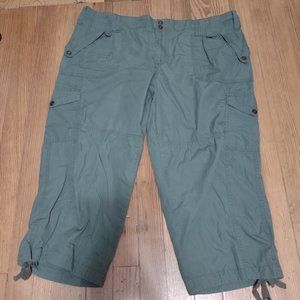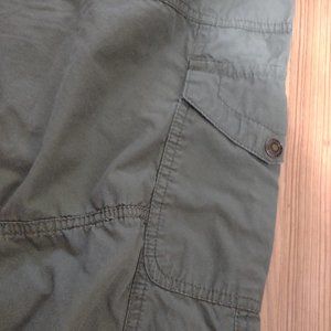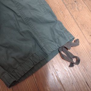 LOTS of pockets!!! In really great condition, and super comfortable (fit is a bit loose). Snap & zipper close front. Pockets everywhere... front, back, side,... and ties at the ankles.