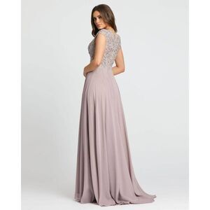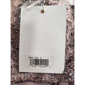 Hand-embellished mesh bodice; chiffon skirt (100% polyester)