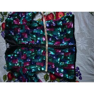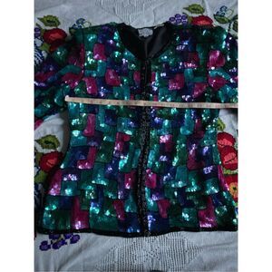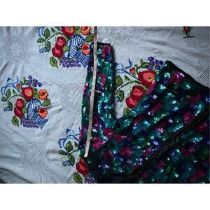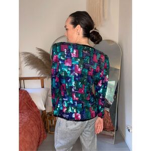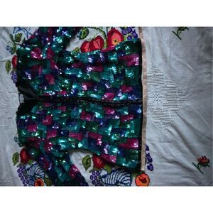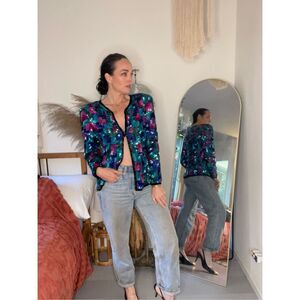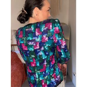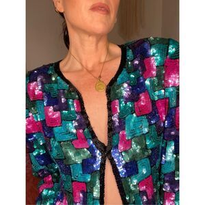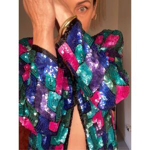 This stunning vintage jacket, crafted in India in the 1990s, features an iridescent sequin design that shimmers in captivating shades of purple, pink, and green. The intricate glass beading trim adds a distinctive touch, enhancing its unique charm and elegance. Perfect for making a statement, this piece is a true representation of the vibrant craftsmanship and artistry of its time.