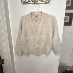 Super soft and cozy statement sweater featuring luxe faux fur trim at the hem and sleeves. Feminine, boho, and perfect for fall & winter layering.
