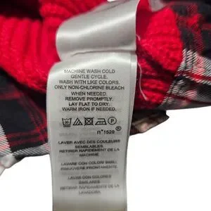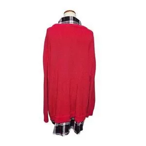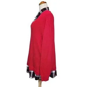 Red knit sweater with attached plaid collar and hem. Layered look, crew neck. 100% cotton. Size 3X. Classic preppy style perfect for fall!
