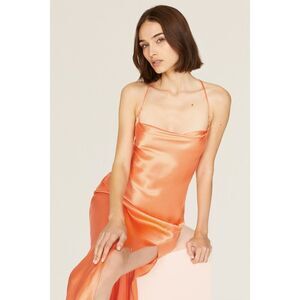 A beautiful sorbet orange makes this mesmerizing slip dress by Bec & Bridge featuring an exposed back and thigh-high slit.