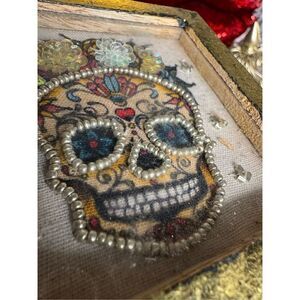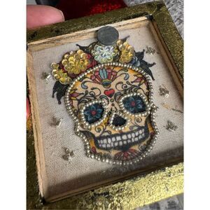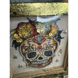 Beautiful, gilded framework edges with the interior on a canvas linen background multicolored tattoo/ heart & spiral designs adorn the skull in typical sugar skull look, a beautiful crown of flowers detailed with shimmering sequins sits atop the head