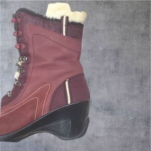 boho boots with decorative top stitching, lace up style. They are true to size (7). Faux fur is very soft and warm. Adorable boots!