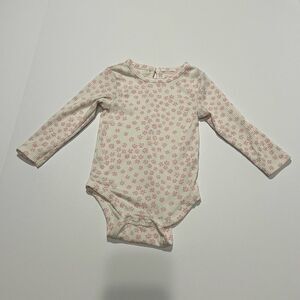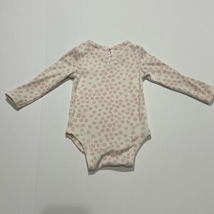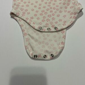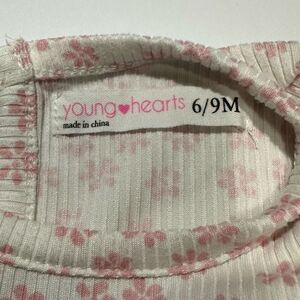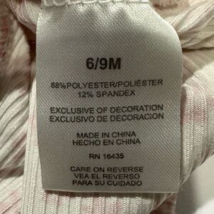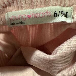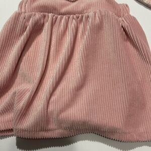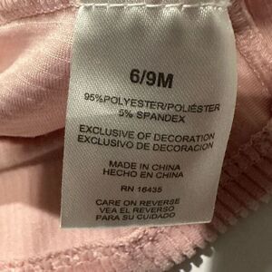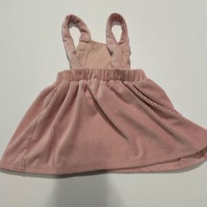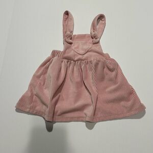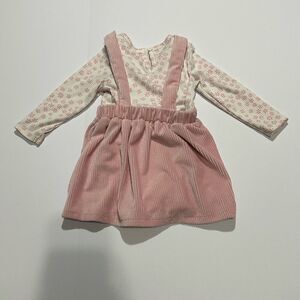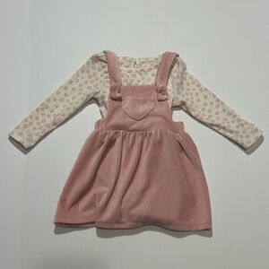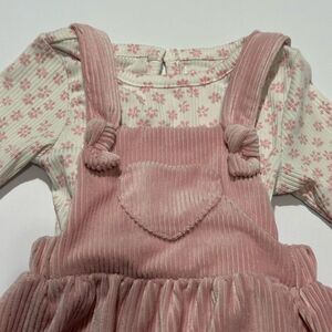 This dress is a 2 piece. The onesie is a long sleeve white shirt with pink flowers. Buttons at the bottom. Dress is pink corduroy with overalls and a heart in the front. Waistband is stretchy. Made with polyester and spandex. Pre-Owned-Excellent condition.