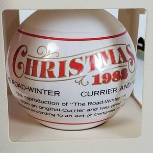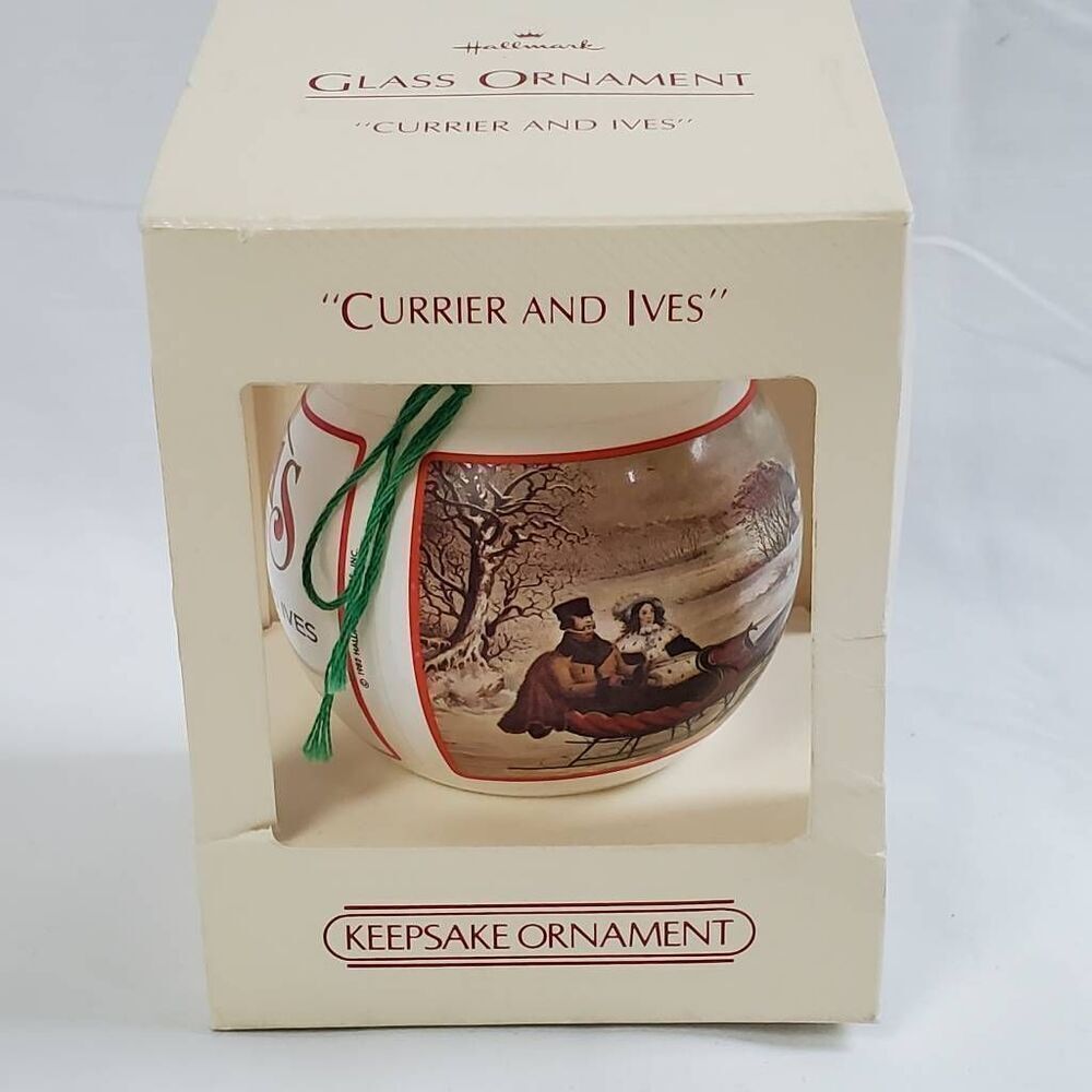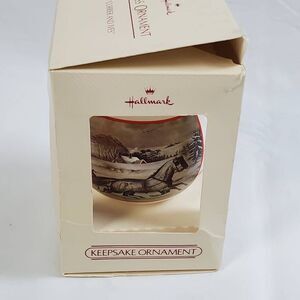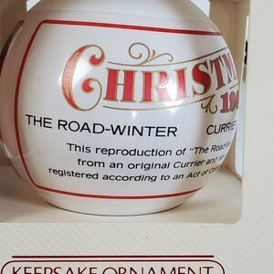 Celebrate the warmth of holidays past with this 1988 Hallmark Keepsake Ornament featuring a classic Currier and Ives winter sleigh scene. Titled "The Road-Winter", this vintage glass ornament beautifully reproduces the nostalgic imagery from The Saturday Evening Post. Comes in the original cream-colored box with red accents and green hanging cord. A must-have for collectors of Hallmark or classic Americana.