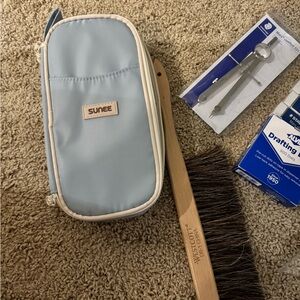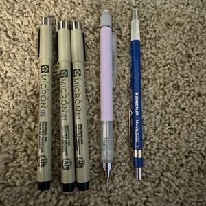 Comprehensive drafting tools set includes: Staedtler 2MM TECHNICO 780 LEAD HOLDER + lead pointer, 10 inch adjustable triangle w/slope/rse, 10 inch 30/60/90 metal triangle, metal triangular architecture scale, drafting dots, pencil sharpener, Staedtler Mars white plastic erasers (x4), 6.0” Mars comfort 551 Compass, drafting dusting brush, cute pencil case, pouch of Ticonderoga #2’s, monograph mechanical pencil, Pigma Micron 01 archival ink pens (x3). Most of the items have never been used, brand new!